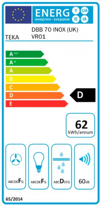 Campana decorativa Teka DBB 70 de 70 cm, con capacidad de extracción de 380 m³/h, 3 velocidades y motor de doble turbina.